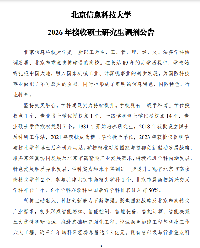 北京信息科技大学2026年接收硕士研究生调剂公告