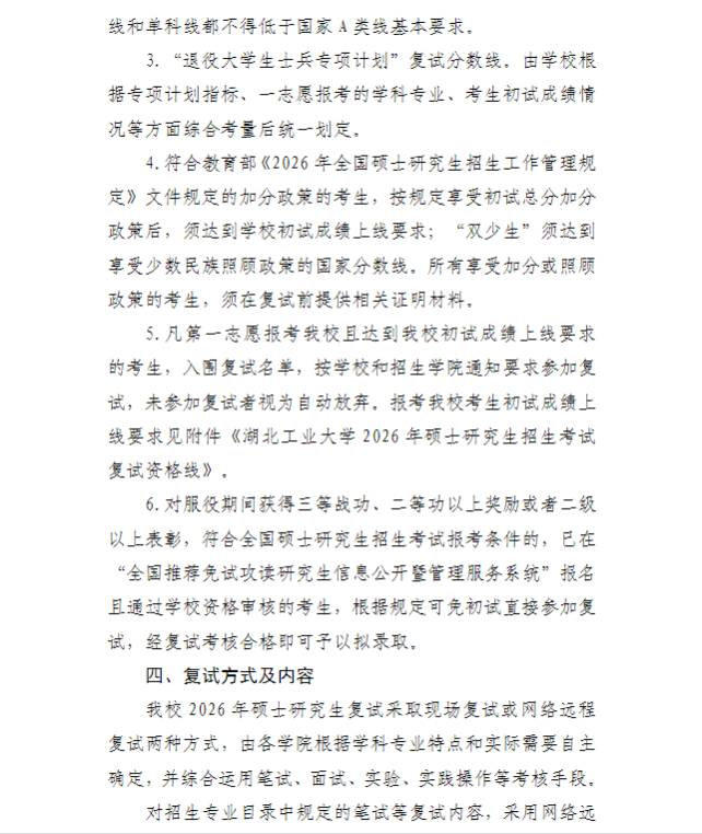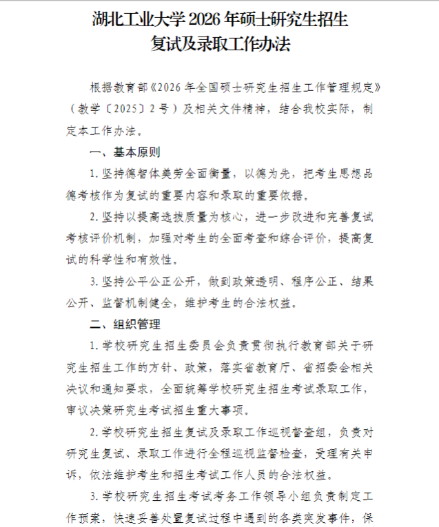湖北工业大学2026年硕士研究生招生复试及录取工作办法